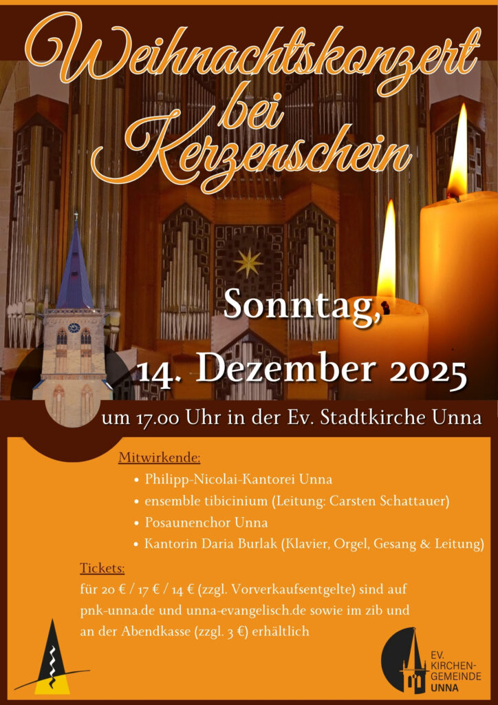 Herzliche Einladung zum traditionellen Weihnachtskonzert bei Kerzenschein am 3. Adventssonntag, den 14. Dezember um 17:00 Uhr. Die Philipp-Nicolai-Kantorei Unna, der Posaunenchor Unna sowie das ensemble tibicinium (Leitung: Carsten Schattauer) musizieren unter der Leitung von Kantorin Daria Burlak, die auch am Flügel, an der Orgel und als Sopranistin zu hören sein wird. Im bunt gemischten Programm finden sich traditionelle Advents- und Weihnachtslieder wie „Tochter Zion“, „Stille Nacht“ oder „O du fröhliche“ (auch das Publikum ist dabei zum Mitsingen eingeladen!), keltische Musik, stimmungsvolle Adventsmeditationen, Filmklassiker wie „Drei Haselnüsse für Aschenbrödel“, Weihnachtslieder von John Rutter, der in diesem Jahr sein 80. Jubiläum feierte, aber auch Werke aus der Zeit der Renaissance sowie in Originalsprachen gesungene weihnachtliche Musik aus Schweden und Argentinien, die in der vom Kerzenschein beleuchteten historischen Stadtkirche ihre Wirkung entfalten wird.